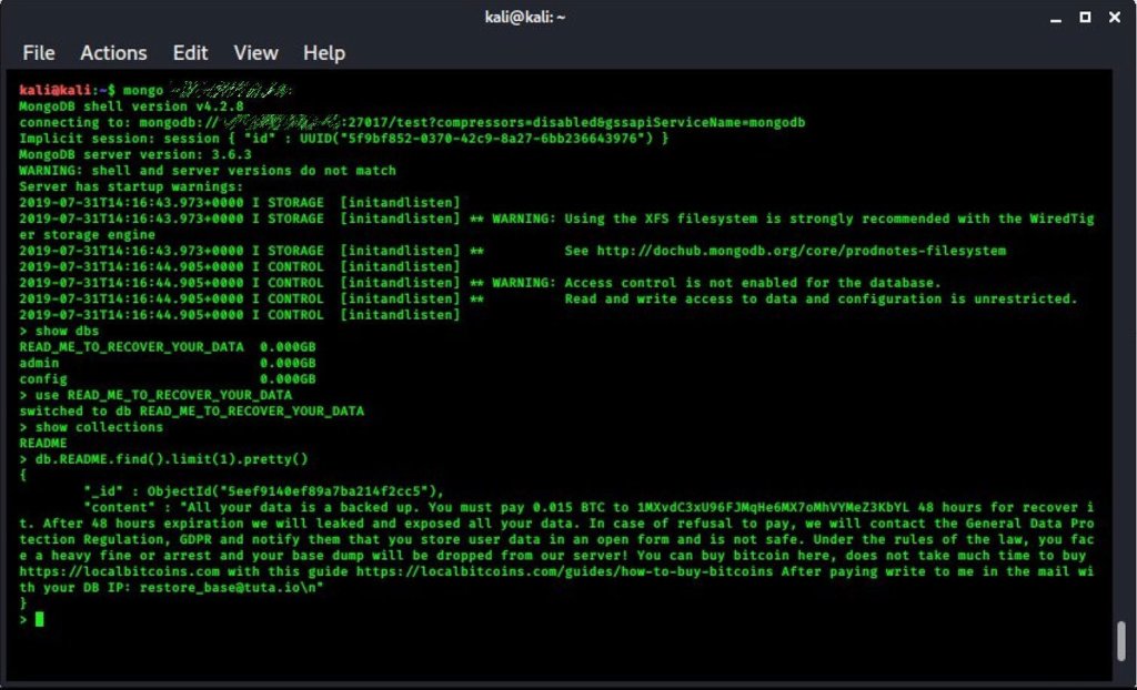 Once they gain access to the MongoDB server, attackers wipe the databases and create a new database called âREAD_ME_TO_RECOVER_YOUR_DATA.â