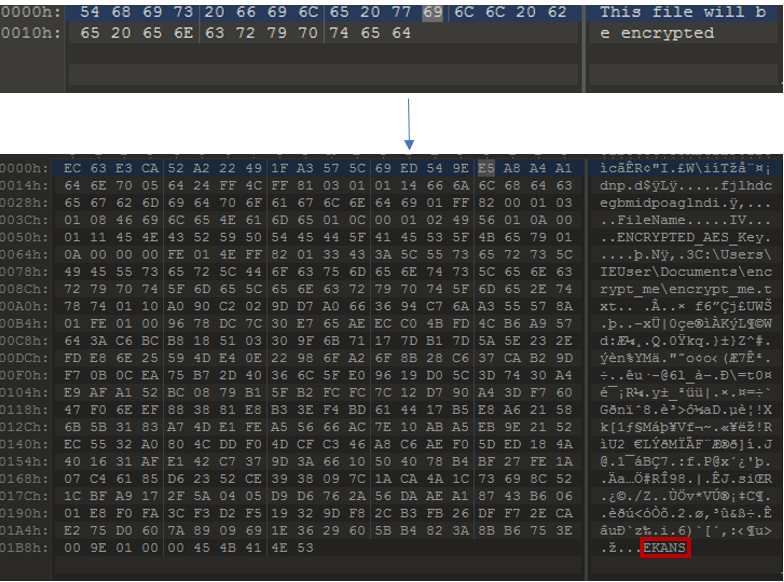 The malware appends a random five-character string to the extension of the encrypted files and the word EKANS to the end of the file (i.e. For example, our encrypt_me.txt file was changed to encrypt_me.txtDwtwx.)