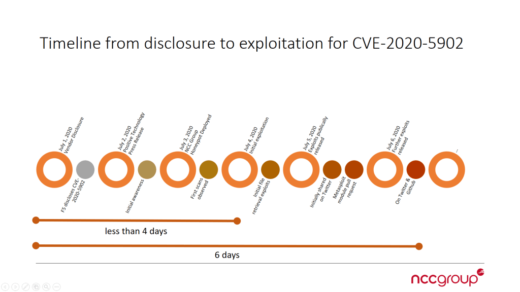 “CVE-2020-5902 was disclosed on July 1st, 2020 by F5 Networks in K52145254 as a CVSS 10.0 remote code execution vulnerability in the Big-IP administrative interface. By July 3rd, 2020 NCC Group observed active exploitation.” reported NCC. “