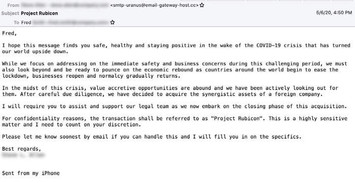 According to Agari’s investigation, an attack typically begins with the gang’s impersonation of a company’s CEO, asking a targeted employee to work with “external legal counsel” to co-ordinate payments required to close a fake corporate merger or acquisition. Of course, the scammers also require the targeted employee to keep details of the transaction strictly confidential because of their “sensitive nature.”