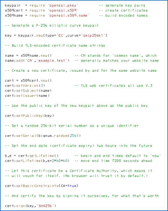 Here, we’ve used OpenSSL, via a simple series of Lua script commands, to produce a public/private keypair, put the public key into a web certificate, make the certificate valid for 7200 seconds (two hours), and set the certificate to be authoritative.