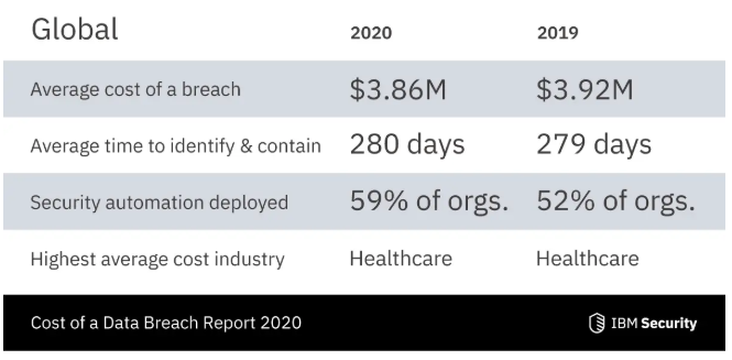 2020 Cost of a Data Breach Report: the global total cost of a data breach averaged $3.86 million in 2020, down about 1.5% from the 2019 study.