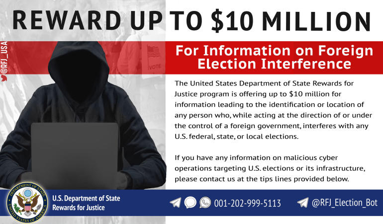 The US Department of State announced today rewards of up to $10 million for any information leading to the identification of any person who works with or for a foreign government for the purpose of interfering with US elections through “illegal cyber activities.”