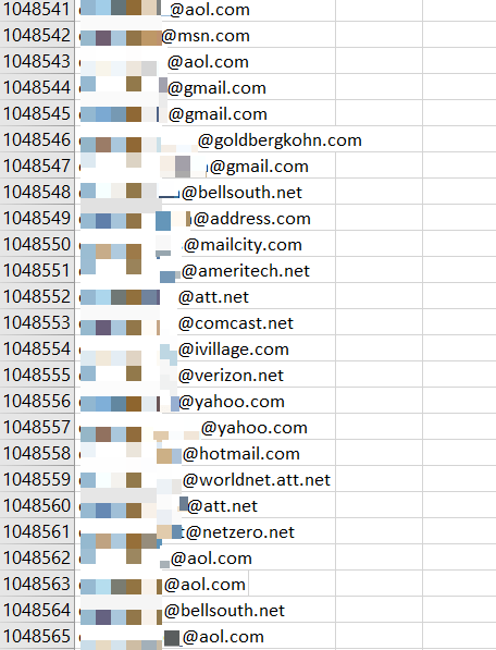 - The remaining seven CSV files were unencrypted, each of which included 50,000,000 strings of unique email addresses of (presumably) US users