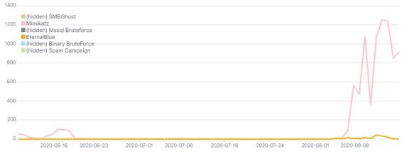 It is interesting to note that the attackers between early June and August, disabled the EternalBlue and Mimikatz modules, likely to measure the effectiveness of the SMBGhostâs module.