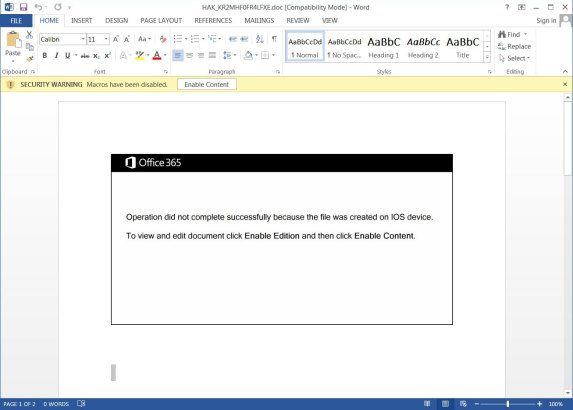 To trick a user into enabling the macros, Emotet botnet operators use a document template that informs them that the document was created on iOS and cannot be properly viewed unless the ‘Enable Content’ button is clicked.