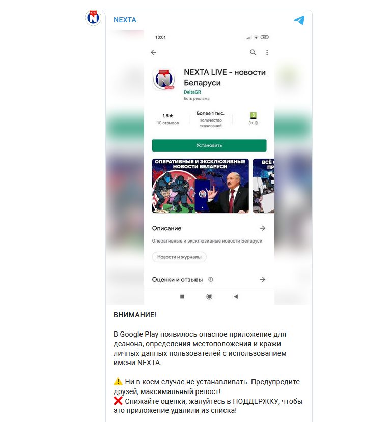 “Do not install under any circumstances. Warn your friends, maximum repost!,” Nexta staff wrote in their Telegram channel.