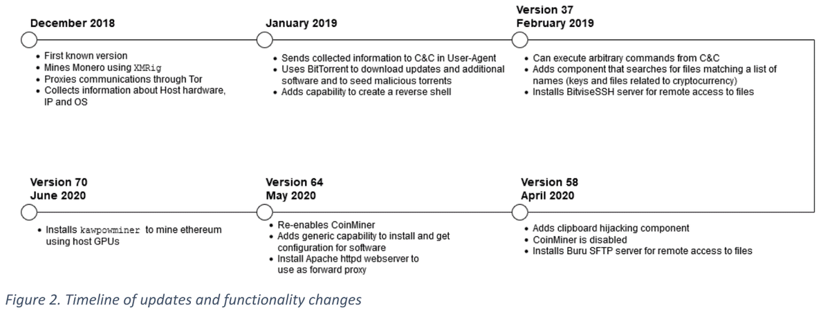 ESET says KryptoCibule uses the Tor client to securely communicate with its command-and-control (C&C) servers, hosted on the dark web, while the torrent client is used to load torrent files that will eventually download other additional modules, such as proxy servers, crypto-mining modules, and HTTP and SFT servers, all useful for one or more tasks in the malware’s modus operandi.