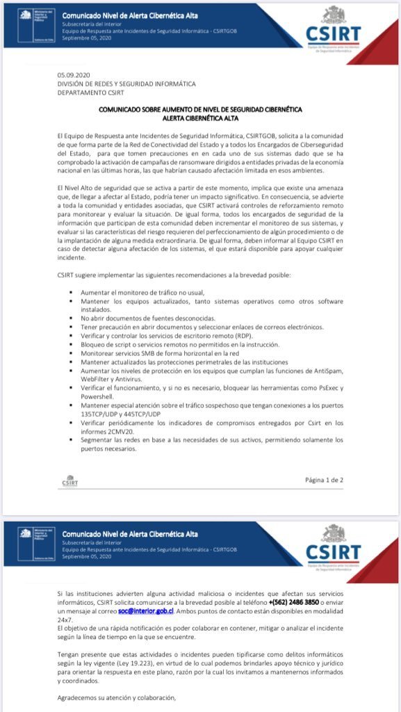 The Chilean CSIRT also issued a cyber-security alert warning about a ransomware campaign targeting the private sector.