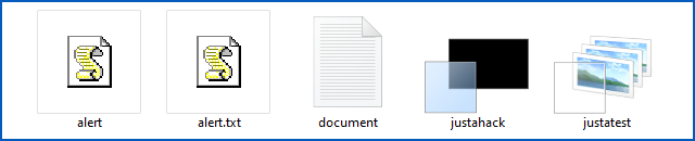 Indeed, if we turn on the View > File name extensions option (highly recomended!) in File Explorer, you’ll see the dangerous truth behind those “scroll icon” files that looked above as though they were called alert and alert.txt:
