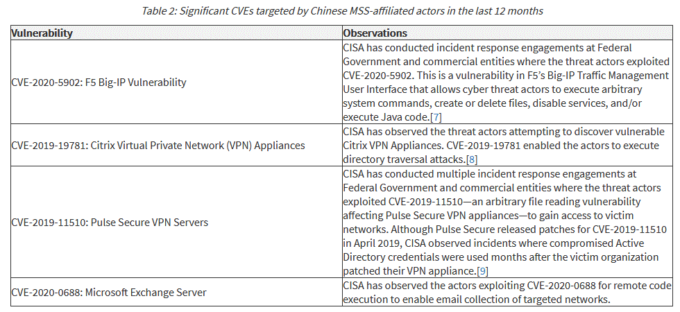 The CISA alert warns the US private sector and government agencies to patch F5, Citrix, Pulse Secure, and Microsoft Exchange devices. However, the alert also warns that Chinese hackers are employing a wide spectrum of other intrusion methods.