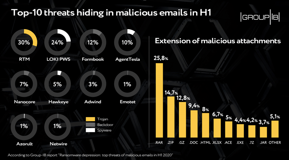 CERT-GIB’s report is based on data collected and analyzed by the Threat Detection System (TDS) Polygon as part of operations to prevent and detect threats distributed online in H1 2020. According to the data of CERT-GIB, in H1 2020, 43 percent of the malicious mails on the radars of Group-IB Threat Detection System had attachments with spyware or links leading to their downloading. Another 17 percent contained downloaders, while backdoors and banking Trojans came third with a 16- and 15-percent shares, respectively. Ransomware, which in the second half of 2019 hid in every second malicious email, almost disappeared from the mailboxes in the first six months of this year with a share of less than 1 percent. Â