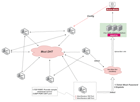 The malware spreads by attempting to guess Telnet passwords of target devices and leveraging known exploits. Once gained access to the device, the bot attempt to execute a malicious payload and the bot will automatically join the Mozi P2P network.