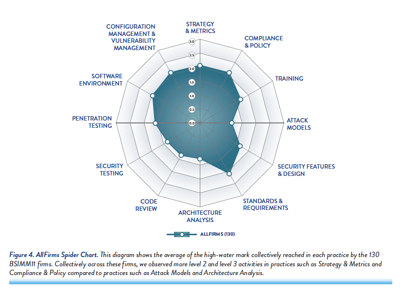 The practices were measured by the model’s proprietary yardstick, which lumps 121 different software security metrics into four major domains: governance, intelligence, secure software development lifecycle (SSDL) touchpoints, and deployment. Each of these domains are further broken down into three practice categories containing numerous activities that slide from simple to very mature.