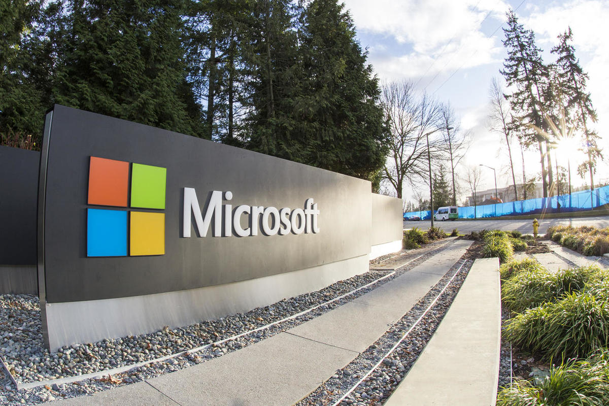 Redmond, WA, USA – January 30, 2018: One of the biggest Microsoft signs is placed next to green trees at a public intersection near Microsoft’s Redmond campus