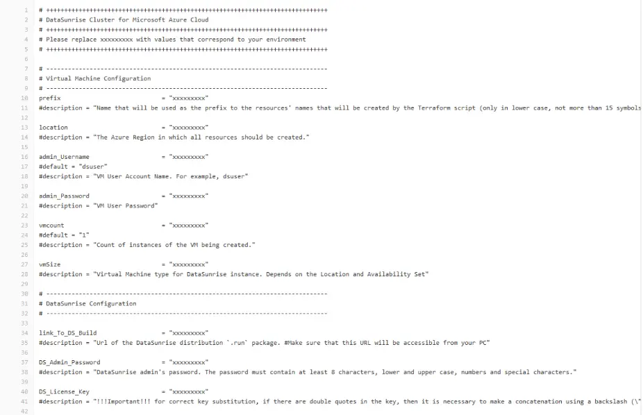 Download Terraform script from the repository to deploy DataSunrise in a HA configuration. Open file terraform.tfvars and replace xxxxxxxxx there with values that correspond to your environment: