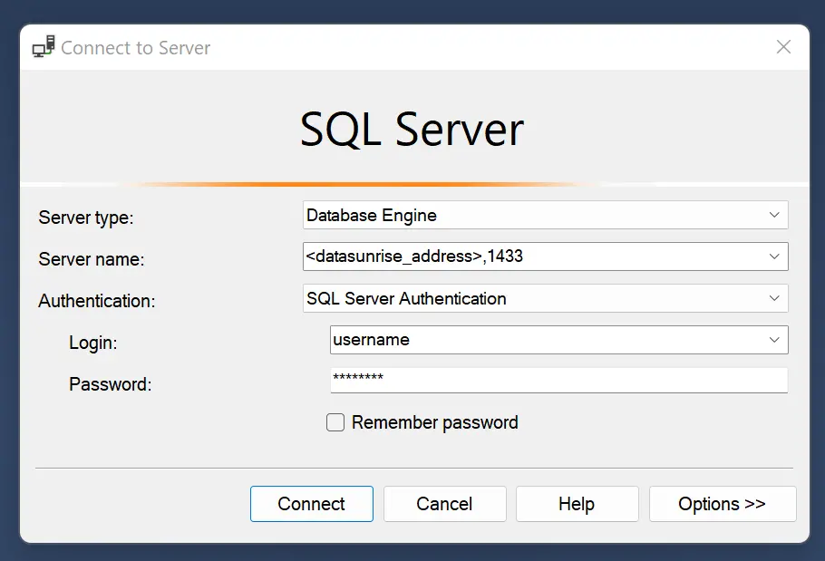 In order to establish the connection to SQL Server Always On Cluster, it will be necessary to connect to the server by specifying DataSunrise IP address and proxy port from the instance configuration: