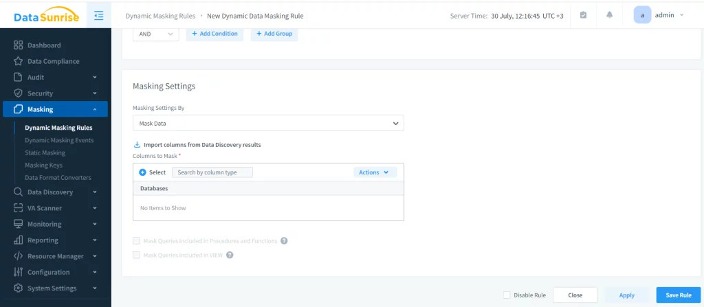 Database administrators must first identify the columns containing sensitive information by configuring masking rule in the corresponding section. This step requires a thorough understanding of the data landscape and potential security risks.