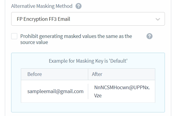 - Set the Alternative Masking Method dropdown to FP Encryption FF3 Email. Alternative masking methods are necessary when maintaining table referential integrity. You cannot simply mask foreign keys with random strings, as this would break references between tables. The masking must ensure that references from other tables still point to the correct rows after masking is applied. Similarly, primary keys must remain unique and maintain their referential relationships with other tables even after masking.