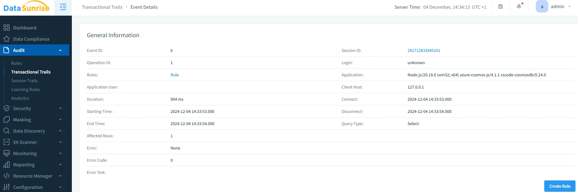 While Azure Cosmos DB for PostgreSQL provides essential native audit capabilities, DataSunrise significantly enhances monitoring with Zero-Touch Compliance Automation and sophisticated analytics designed specifically for distributed PostgreSQL environments. Unlike basic logging approaches, DataSunrise delivers enterprise-grade database activity monitoring with Autonomous Compliance Orchestration, providing comprehensive data protection across distributed database clusters.